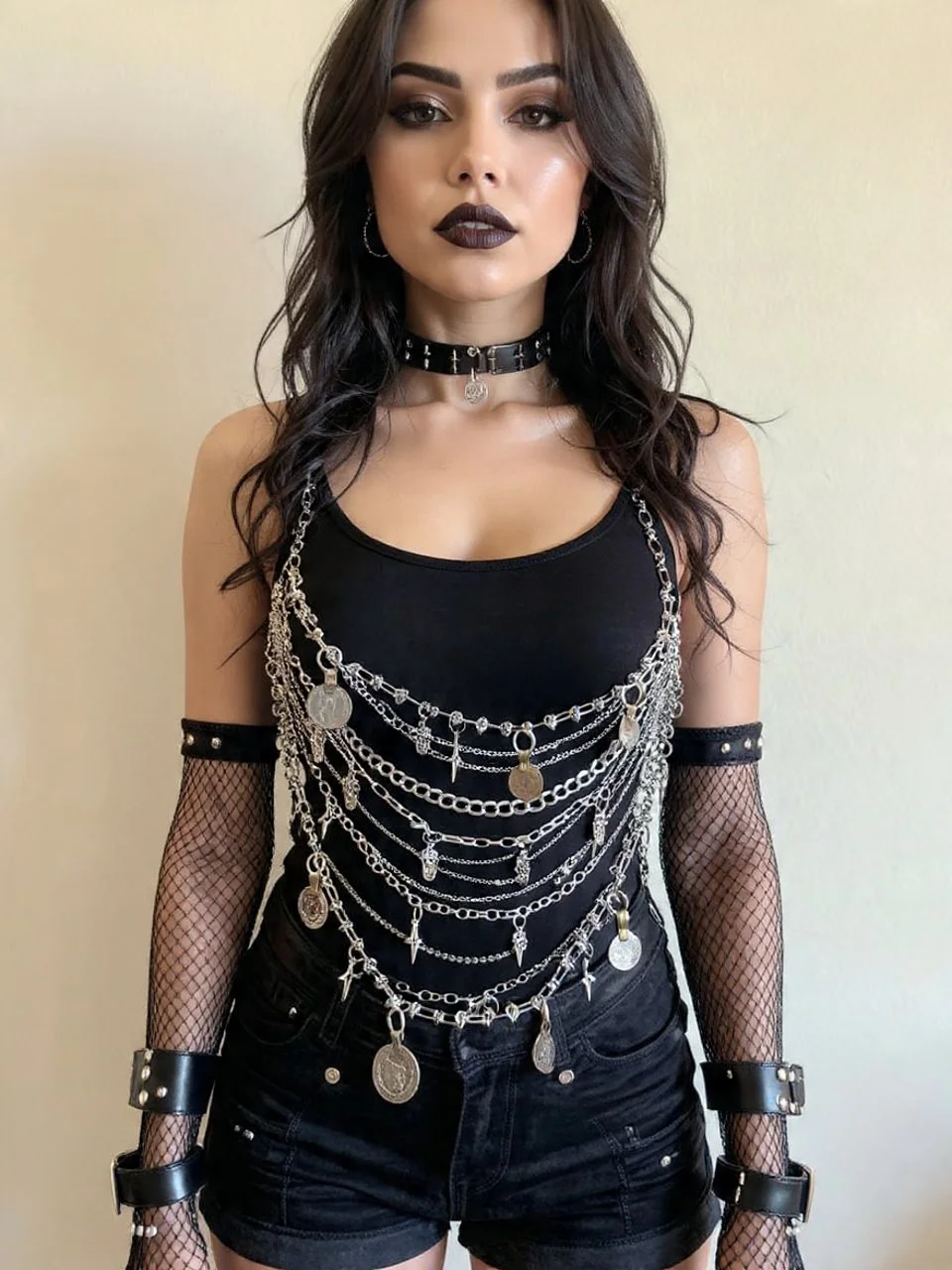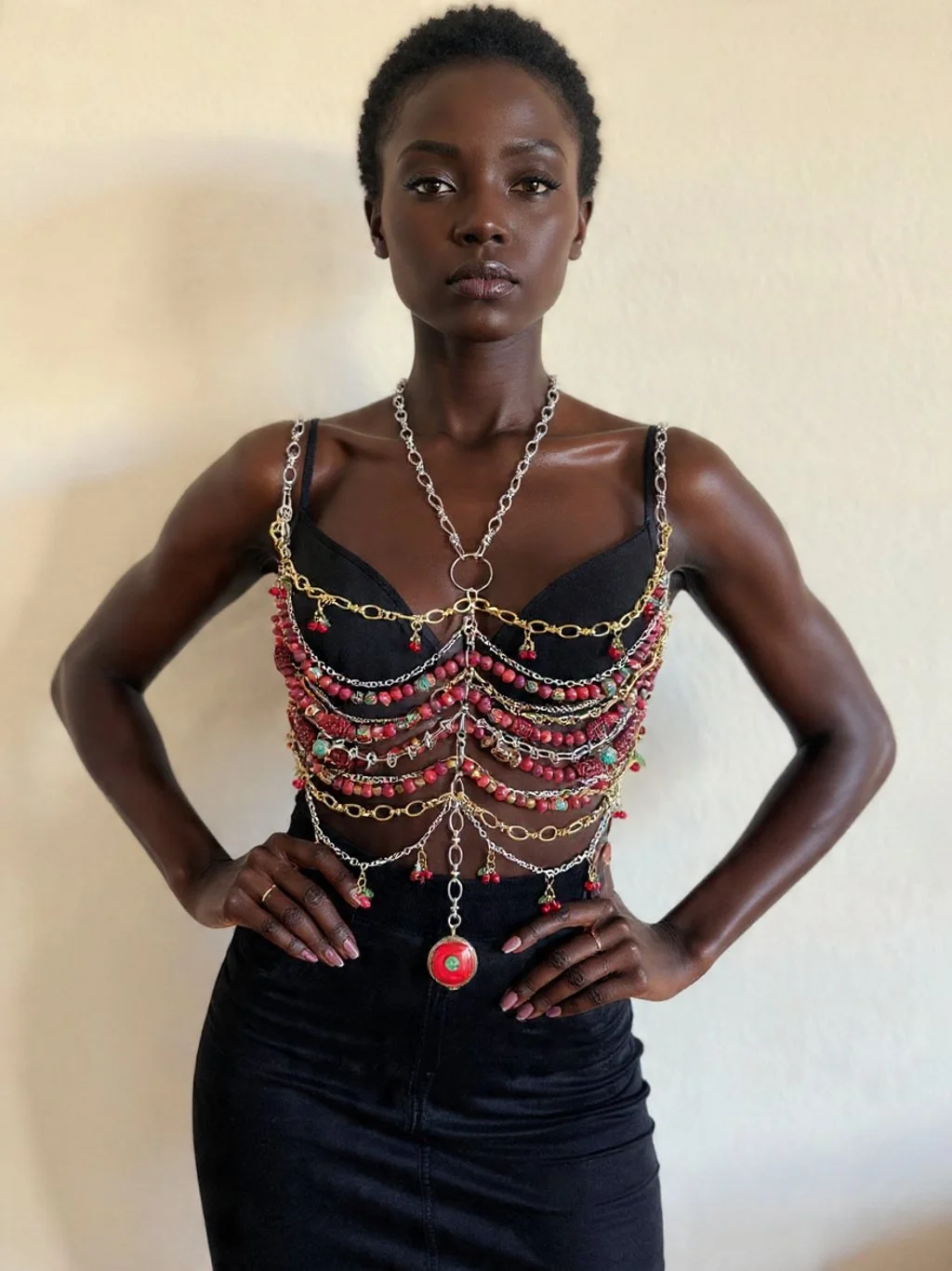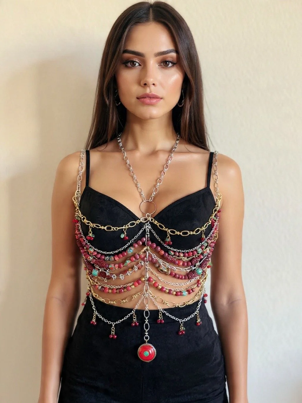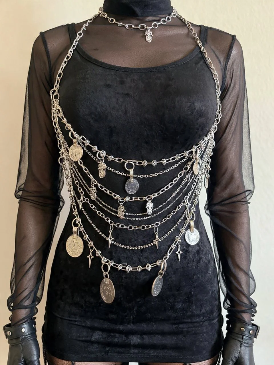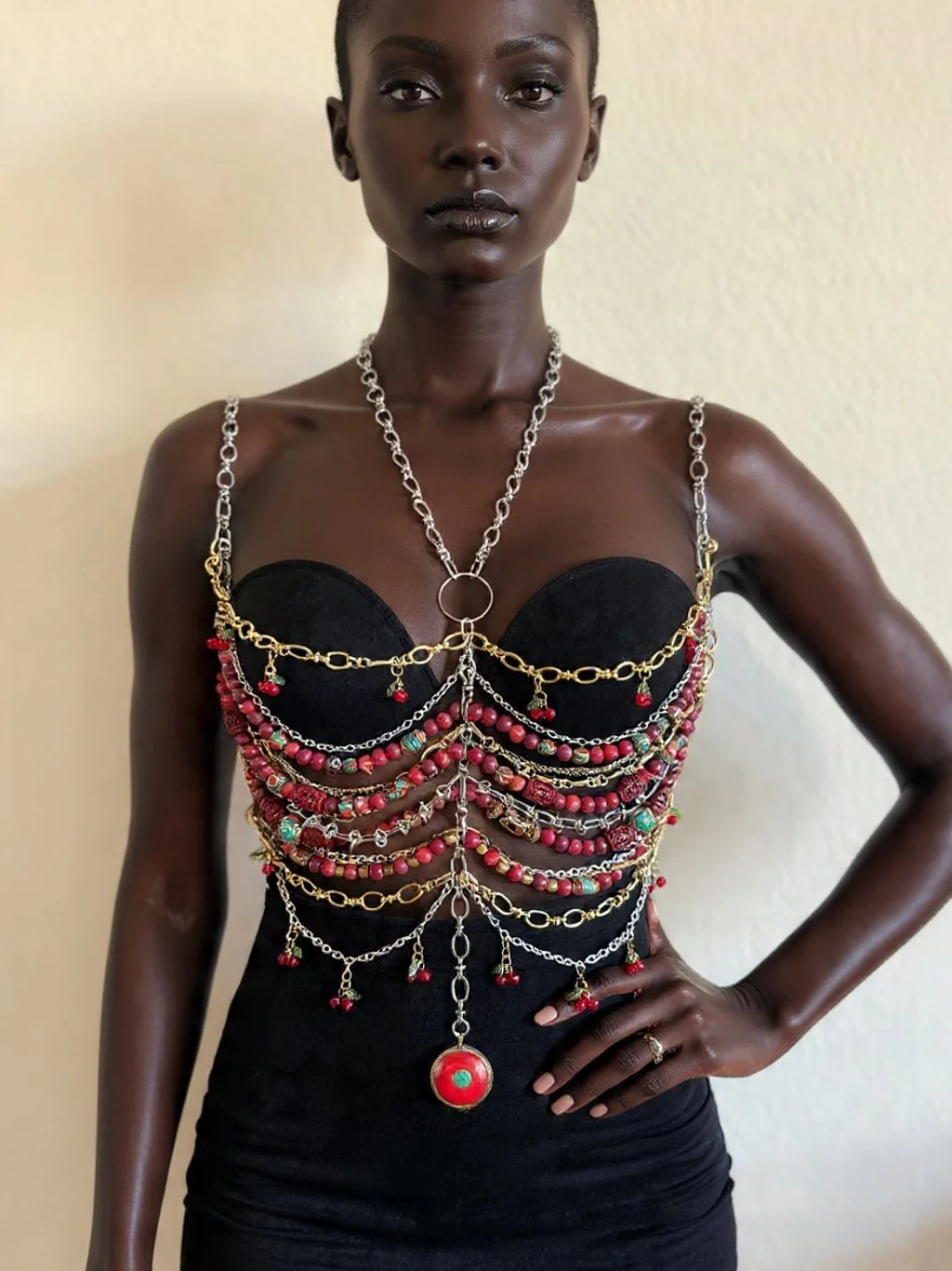 Step into your goddess era with this handcrafted body chain, designed with layers of luxurious stainless-steel chains and natural agate beads in soft mint and turquoise tones. Each strand drapes elegantly across the body, creating a sculptural, armor-like silhouette that blends boho mysticism with regal femininity.